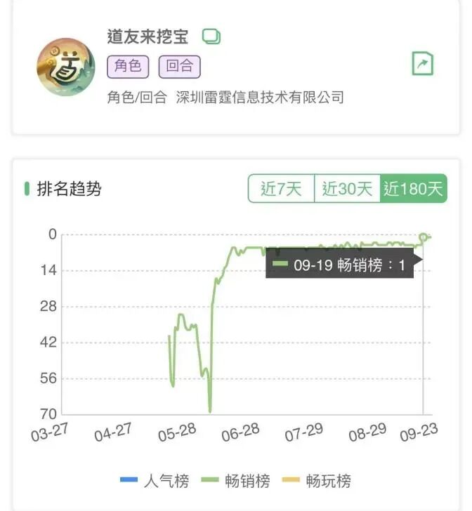 进入9月后,先是诗悦网络《永远的蔚蓝星球》闯进微信小游戏畅销榜TOP10,后是吉比特旗下雷霆游戏发行的《道友来挖宝》更是一举登顶。