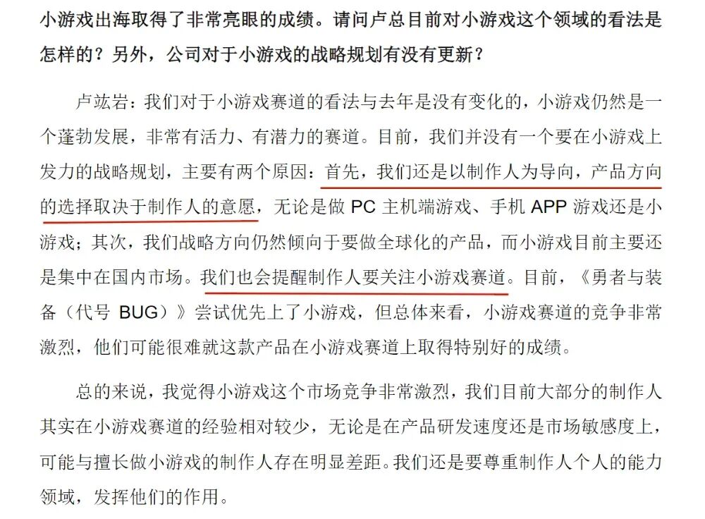 虽然后续在2024年的业绩会上,其CEO卢竑岩的表态显得颇为审慎。他表示,公司对小游戏领域仍主要采取“建议制作人尝试”的态度,主要是团队在这一领域没有太多经验,并且公司的战略方向还是倾向于做全球化的产品。