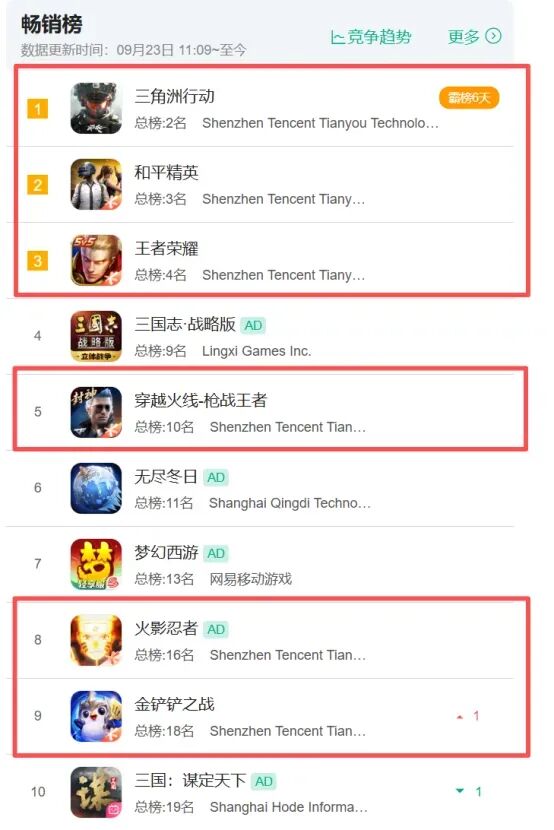 在APP端市场,腾讯已长期稳居畅销榜前10的一半以上席位,各品类的头部产品也形成了强烈的虹吸效应,持续压缩着中腰部厂商的生存空间。
