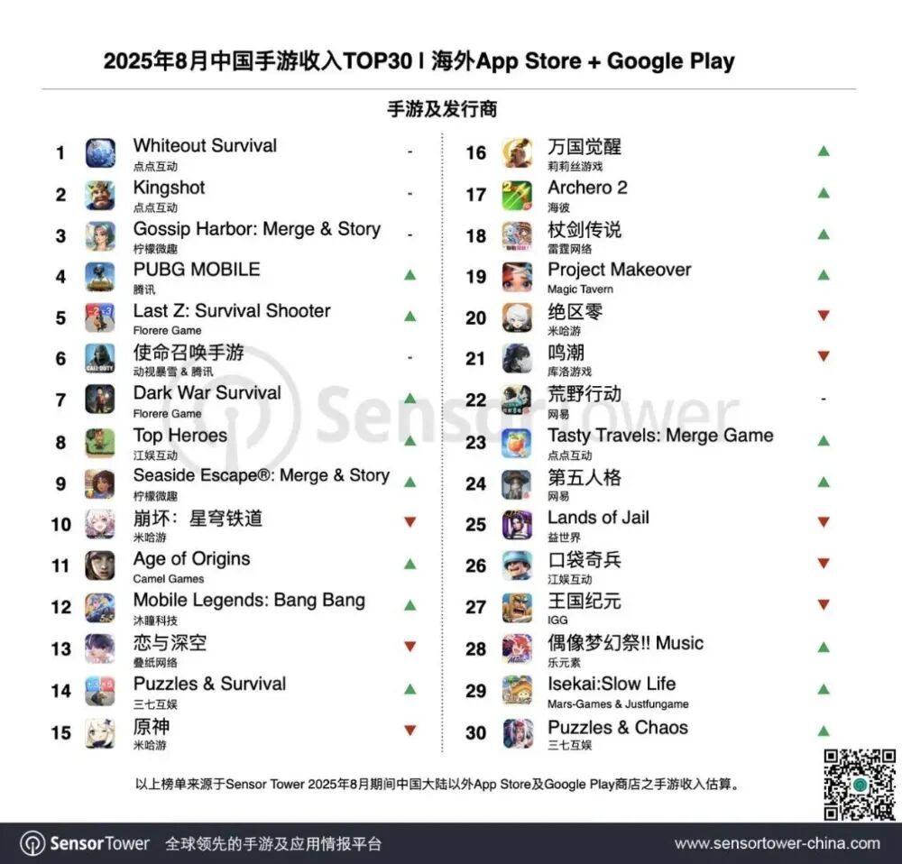 以2025年8月出海游戏收入Top 30榜单为例,多款休闲向SLG占据榜单高位,轻量化、休闲化的策略游戏也成为了SLG赛道探索的主风口。