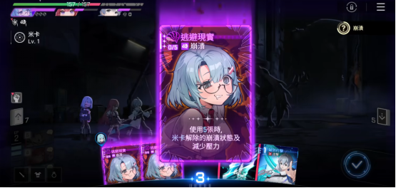 而《卡厄思梦境》最具特色的机制,无疑是和世界观深度绑定的“崩溃”系统。在游戏的世界观设定中,每一位战员均拥有潜藏在内心深处的精神创伤,而在作战过程中,随着接触卡厄思污染的时间越长,战员将面临精神创伤被激发,陷入无尽痛苦的“崩溃”状态中。玩家需完成一定的条件,才可让战员从“崩溃”状态中恢复。