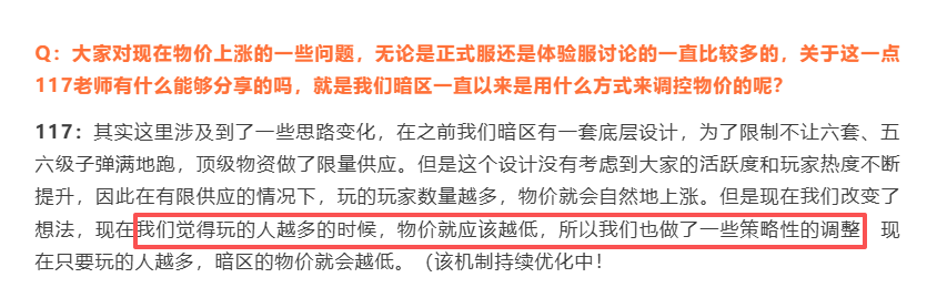 能做到这一点,一个重要原因也在于《暗区突围》能长期深入玩家群体聆听他们的声音,进行及时有效的调控,比如近期策划117在回应S15赛季体验服的问题时就提到,随着玩家群体逐渐壮大,他们也会做策略性调整来保障低物价。