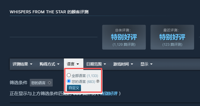 我们先来看首曝之初便因蔡浩宇而备受外界关注的《星之低语》。数据显示,上线2个月有余,《星之低语》仅获得1100来个评论(好评率85%)。