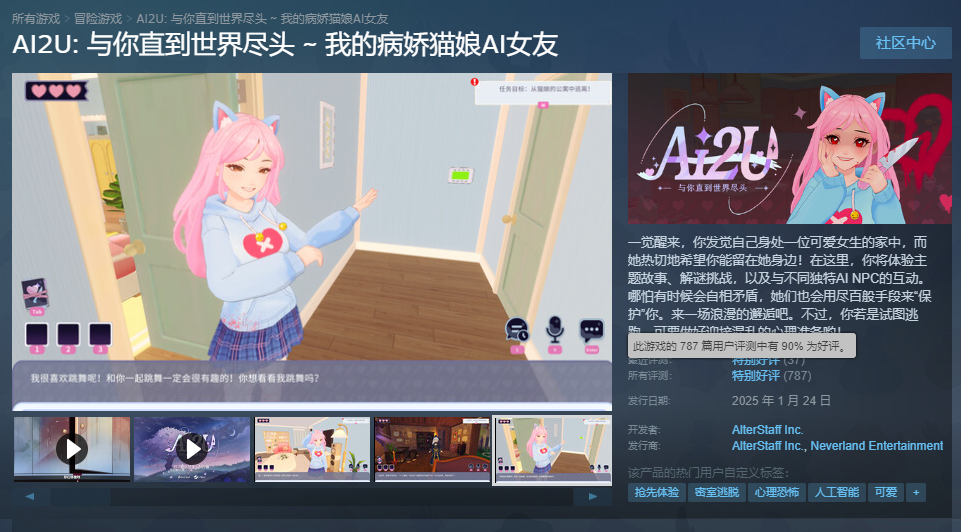 再看拥有百万用户、爆款IP《AI病娇猫娘模拟器》背书,作为续作推出的《AI2U: 与你直到世界尽头 ~ 我的病娇猫娘AI女友》。