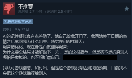 与《星之低语》稍有不同,《AI2U》的负反馈主要集中于AI智能不够、反应太慢以及记性太差。不少玩家肯定了《AI2U》的创意,但该作目前的表现没有达到他们的预期。