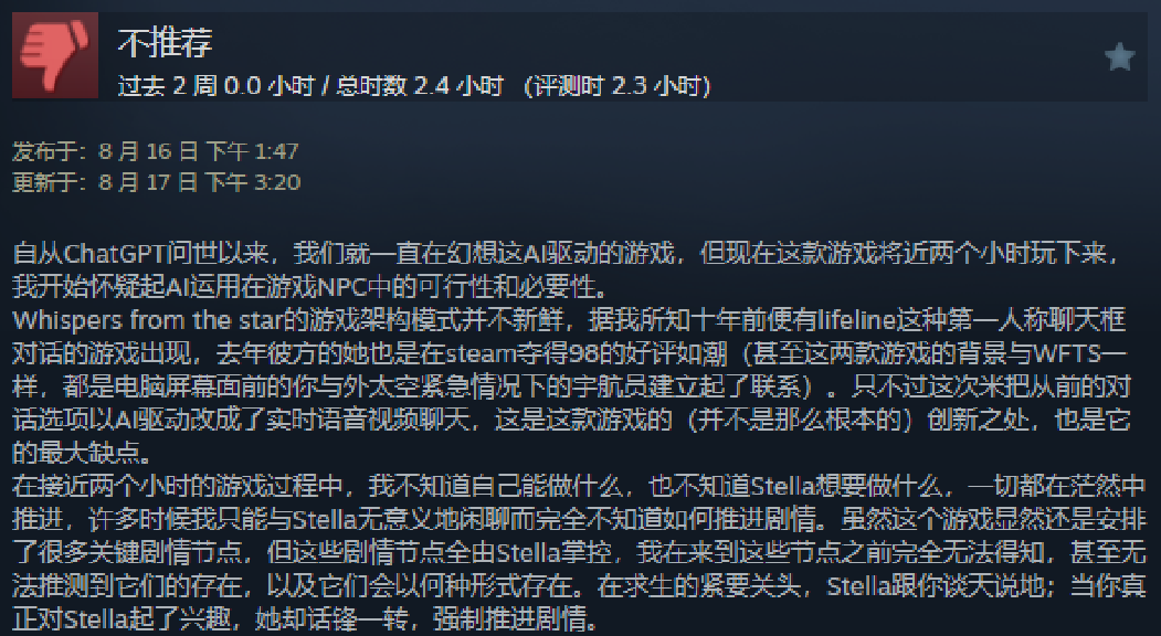 像一位《星之低语》玩家就留言道:“自从ChatGPT问世以来,我们就一直在幻想这种AI驱动的游戏,但现在这款游戏将近两个小时玩下来,我开始怀疑起AI运用在游戏NPC中的可行性和必要性。”
