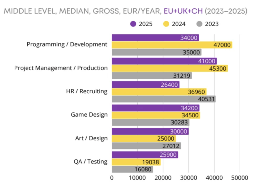 “程序员的薪资——尤其是Unity开发者的薪资——在过去一年几乎被腰斩。”Values Value的创始人Tanja Loktionova在调查报告中表示。而造成降薪的原因,一方面是欧洲游戏行业裁员潮下,企业开放的岗位数量极少,新的招聘机会寥寥无几。