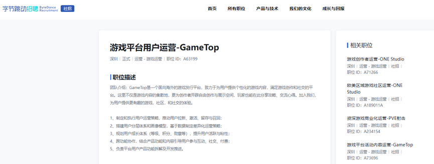 据悉,目前为了推进GameTop平台的建设,字节跳动已启动相关人才招募。其官方招聘页面显示,目前正在招聘多个游戏平台运营岗位,涵盖用户获取、分层管理、增长系统设计等核心职能,具体包括“游戏平台用户运营-GameTop”、“游戏平台活动内容运营-GameTop”等职位。