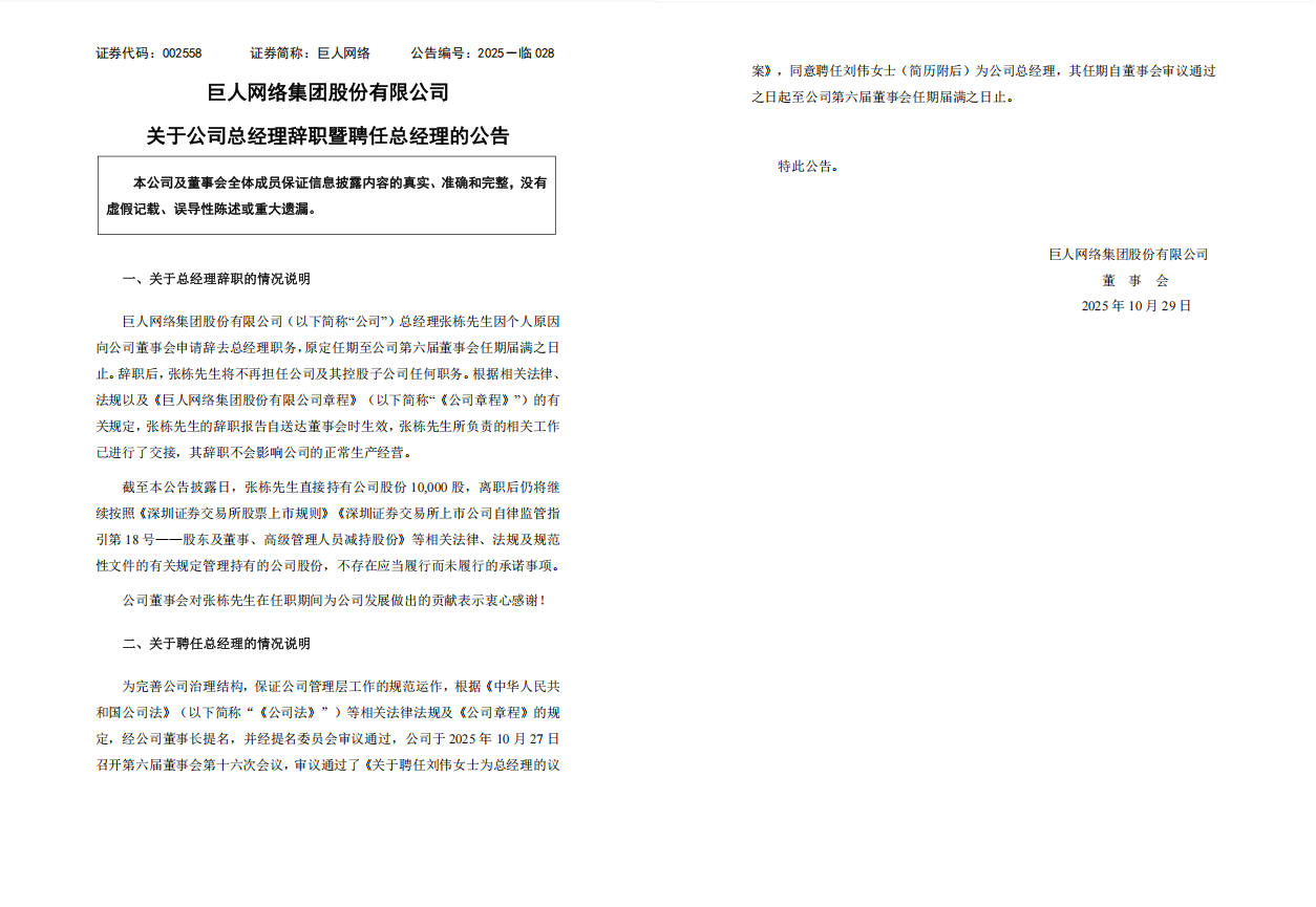 此前,2024年1月1日,巨人网络发布公告,刘伟因个人原因向公司董事会申请辞去CEO职务,公司聘任张栋担任公司CEO。
