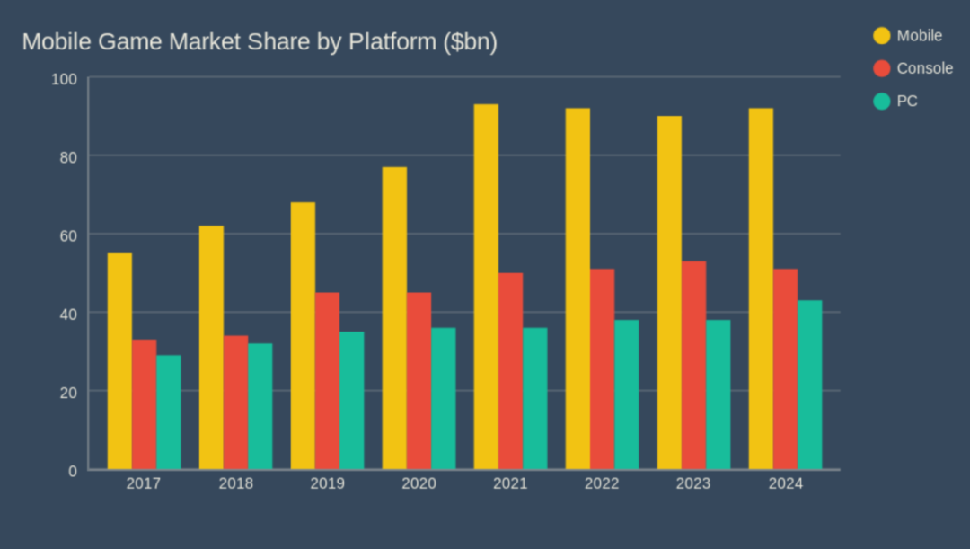 2024年,各类游戏的总收入估计达到1870亿美元,其中移动游戏市场份额为49%,即920亿美元。(Newzoo)