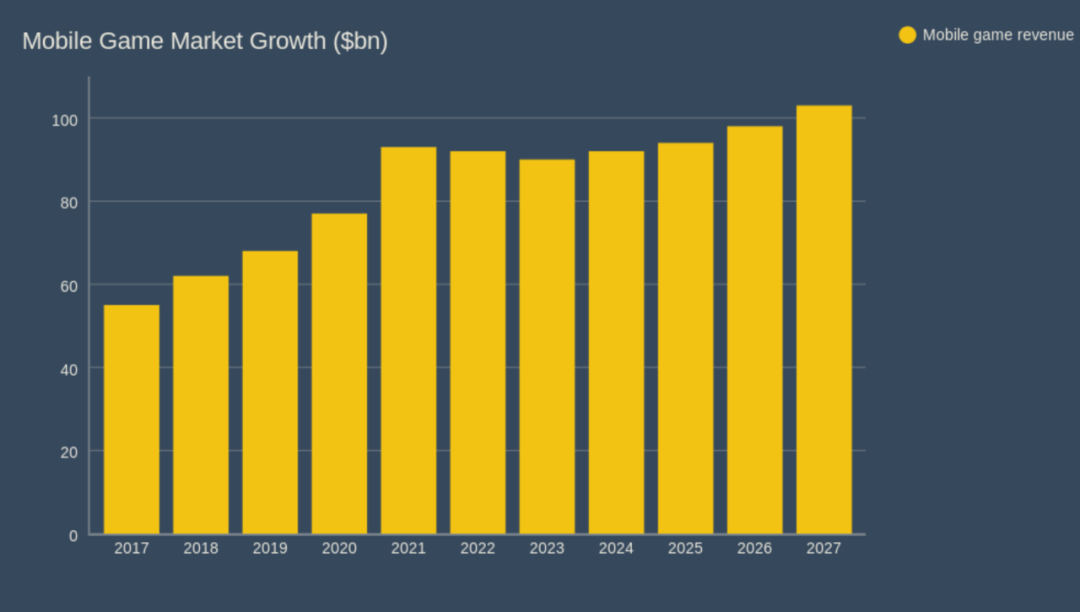 Statista预测,到2027年,移动游戏市场规模将增长至1030亿美元。