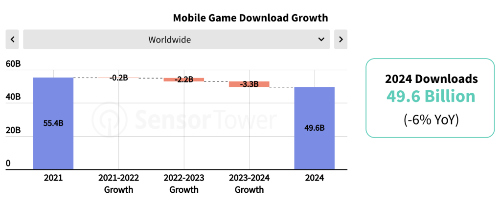 尽管移动游戏收入有所增长,但2024年移动游戏下载量却略有下降,同比下降6%。事实上,移动游戏下载量自2021年以来一直在下降。(SensorTower,2025)