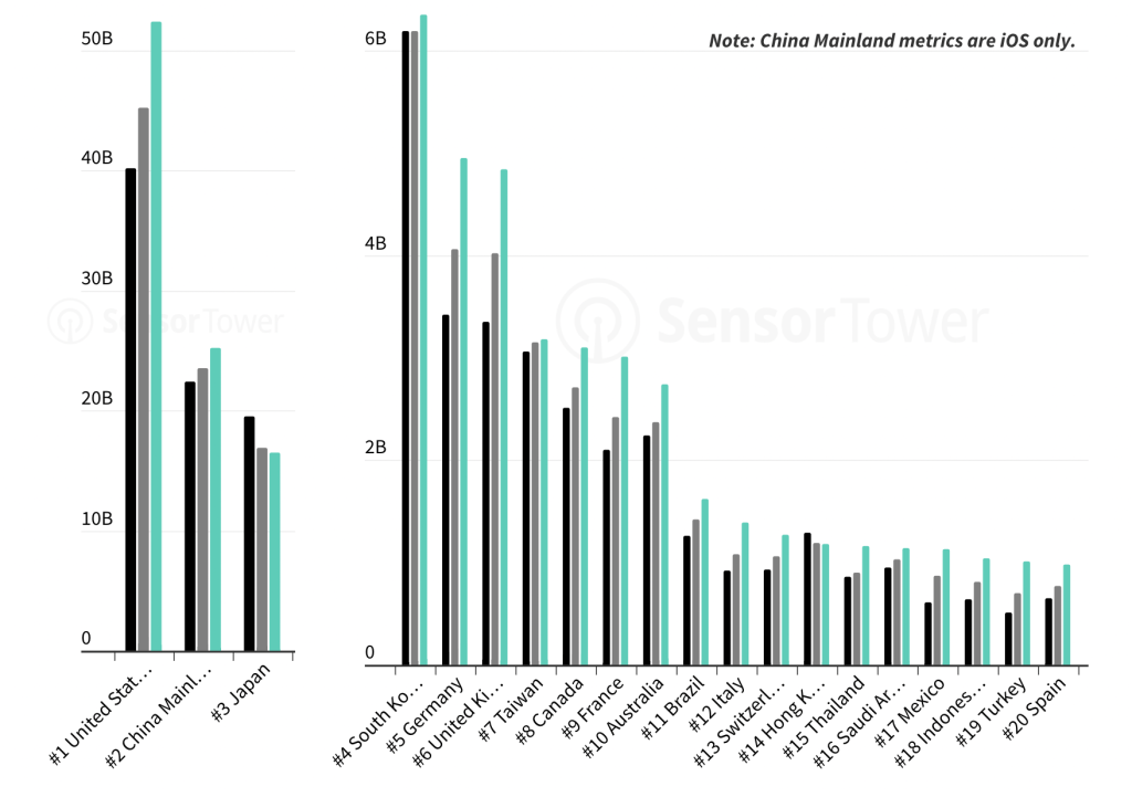 移动端收入激增主要得益于用户使用移动设备的时间增加以及消费者对应用内购买的接受度提高。虽然大多数地区的用户参与度都有所增长,但在美国和日本等市场,用户参与度增长已开始趋于平稳。