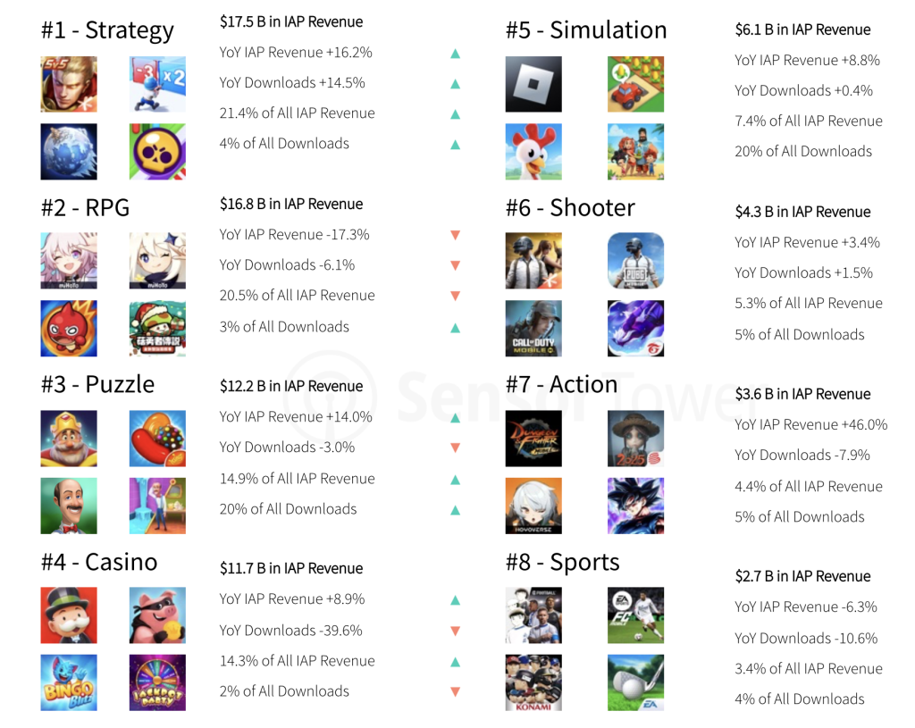 根据SensorTower 的数据,以下是全球移动游戏应用内购买收入最高的几种游戏类型。这些按游戏类型划分的收入统计数据揭示了移动游戏领域最赚钱的类型。