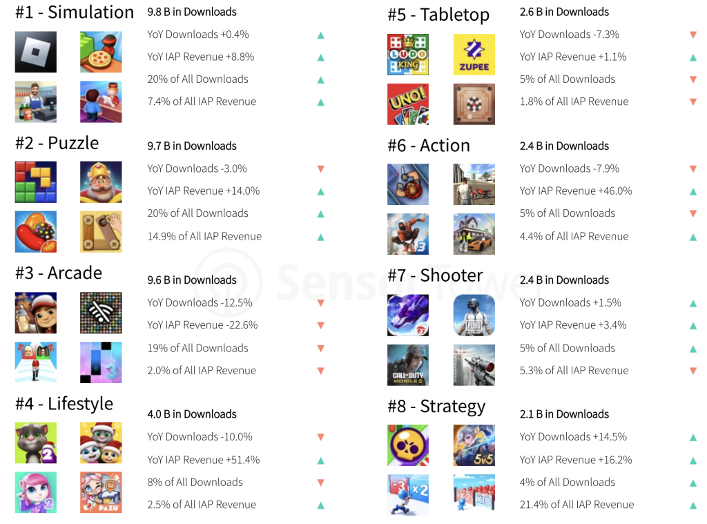 尽管街机游戏下载量下降了12.5%,但仍然很受欢迎,占总下载量的19%。生活方式类和动作类游戏的下载量降幅更大,而策略类游戏的下载量则增长了14.5%。