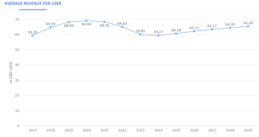 2025年,美国移动游戏的平均每用户收入(ARPU)为60.58美元。预计到2029年将达到65美元。(Statista,2025)