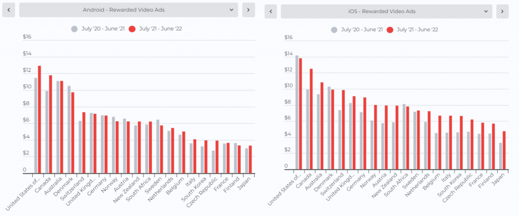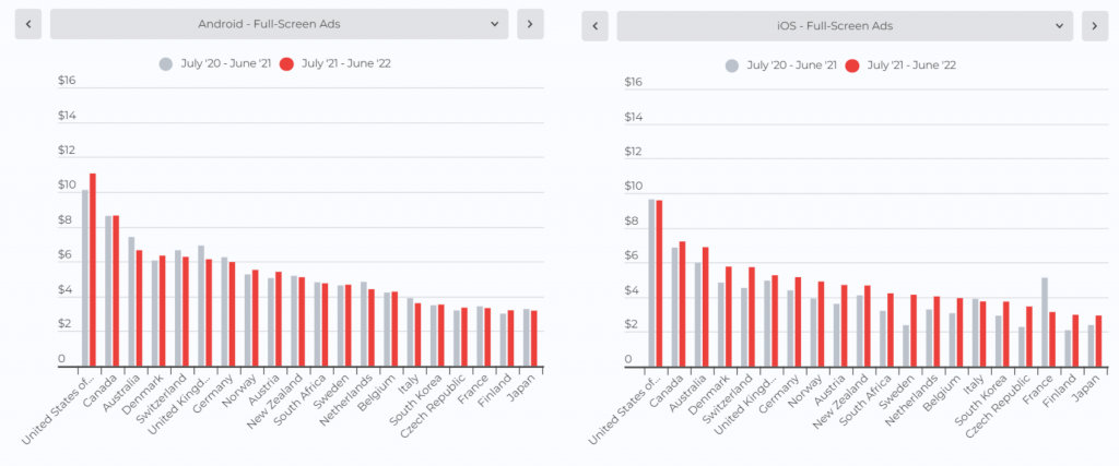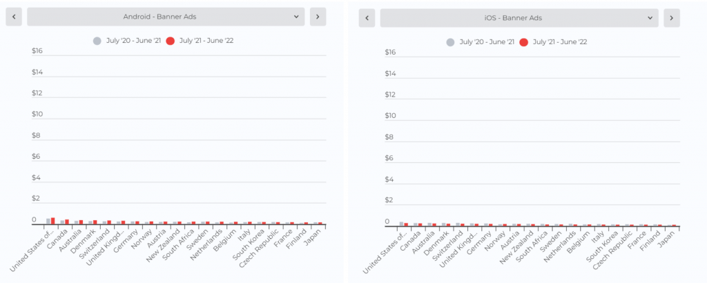 在本节中,我们将为您带来Android 和 iOS 平台上的激励广告、插页式广告和横幅广告按国家/地区划分的 eCPM 报告。