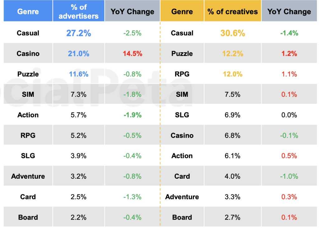 - Android 平台占所有创意素材的 72.3%,其中休闲游戏占所有Android 创意素材的 83% 以上。