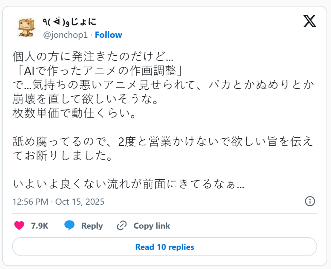 在日本,许多工作室将初稿制作外包至海外,再交由本土导演进行修正已经成为普遍现象。然而,由于预算固定,导演被迫在有限报酬下反复修改低质量原画,导致人才流失。行业本已面临动画师短缺,而AI修正与外包压榨的双重压力,进一步削弱了日本动画的创作生态。
