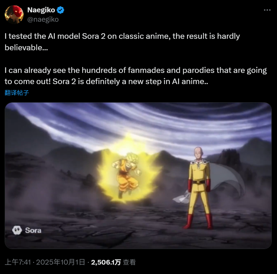 这一现象与月初X用户Naegiko发布的Sora 2生成动画(2500万播放量)形成呼应。短短几十秒:拳风呼啸、气息爆裂,乍一看真有点“热血番”的味道。Naegiko感叹:“我已经能想象未来成百上千的AI同人、AI恶搞动画的诞生了!”这一现象同时加剧了从业者的焦虑——AI不仅可能降低动画制作成本,甚至可能直接取代部分人工岗位。