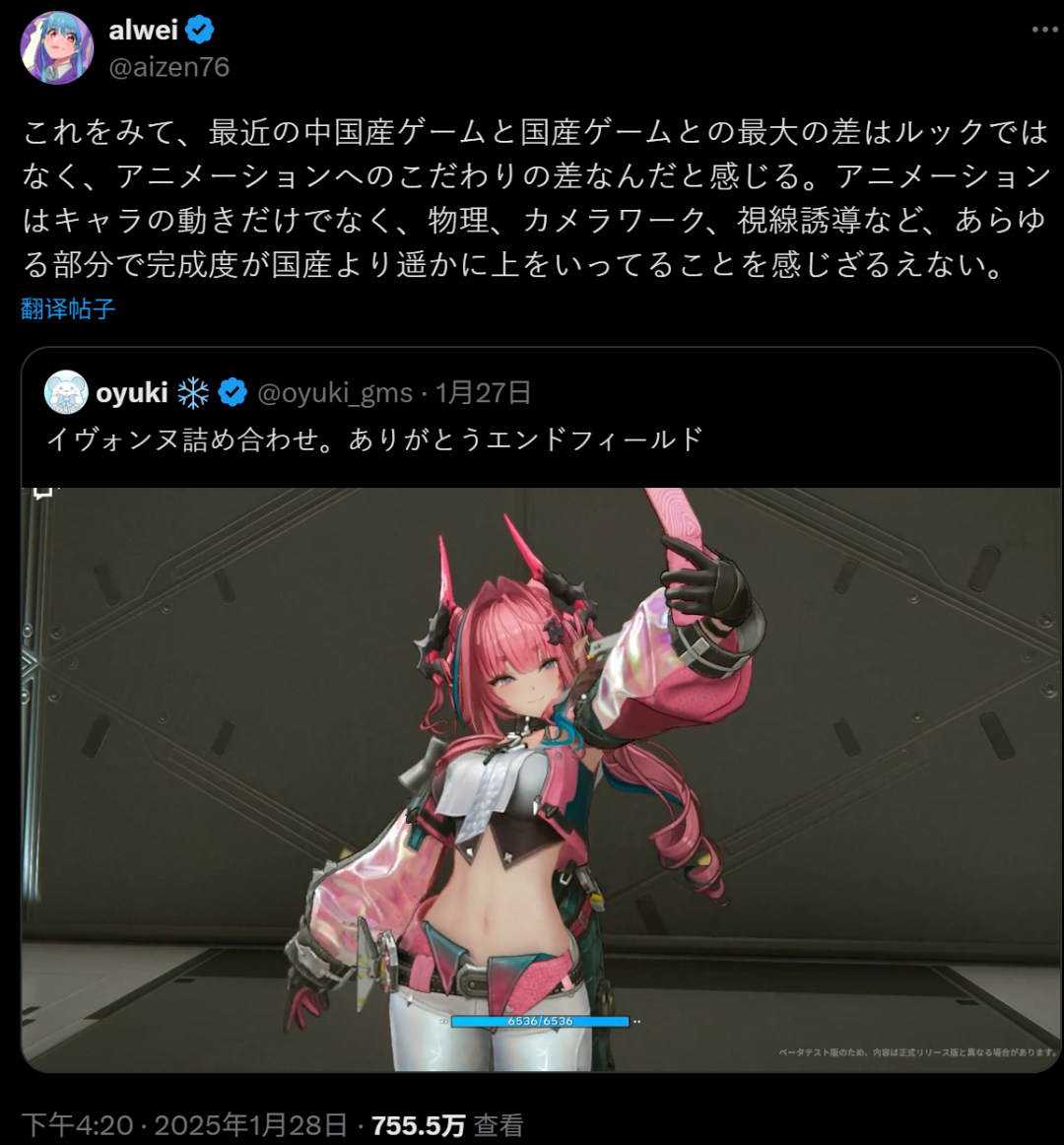 年初,《明日方舟:终末地》的角色动画视频在日本开发者间引发热烈讨论。起因是日本网友在X平台对角色“伊冯”动画的惊叹(视频播放量超755万次):流畅的动作表现、细腻的角色个性刻画,以及细节处理的水准,远超日本本土游戏的普遍水平。
