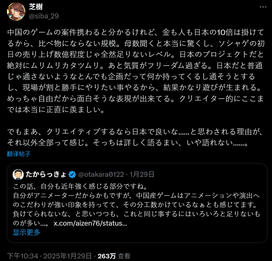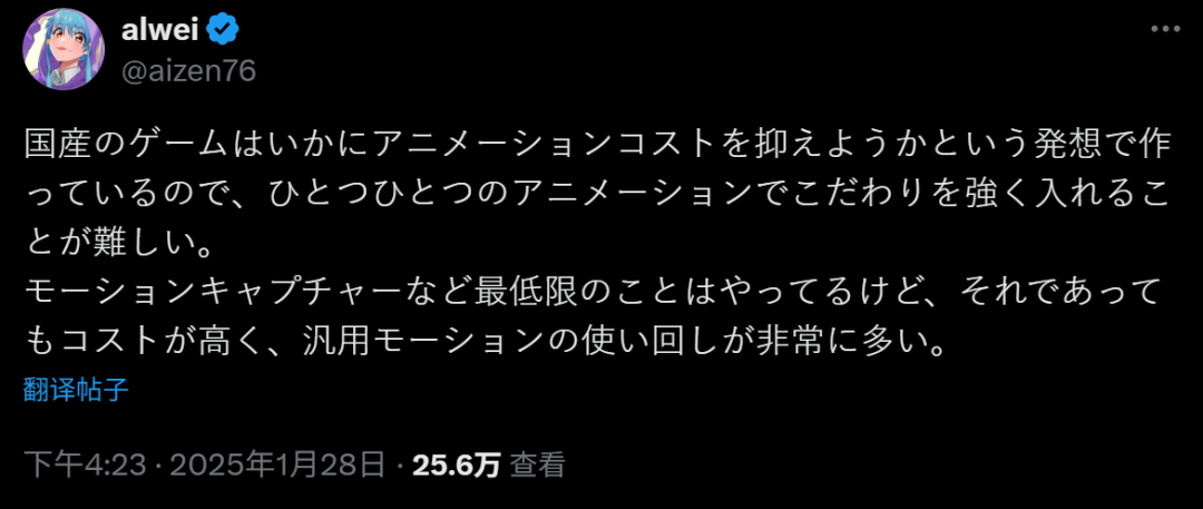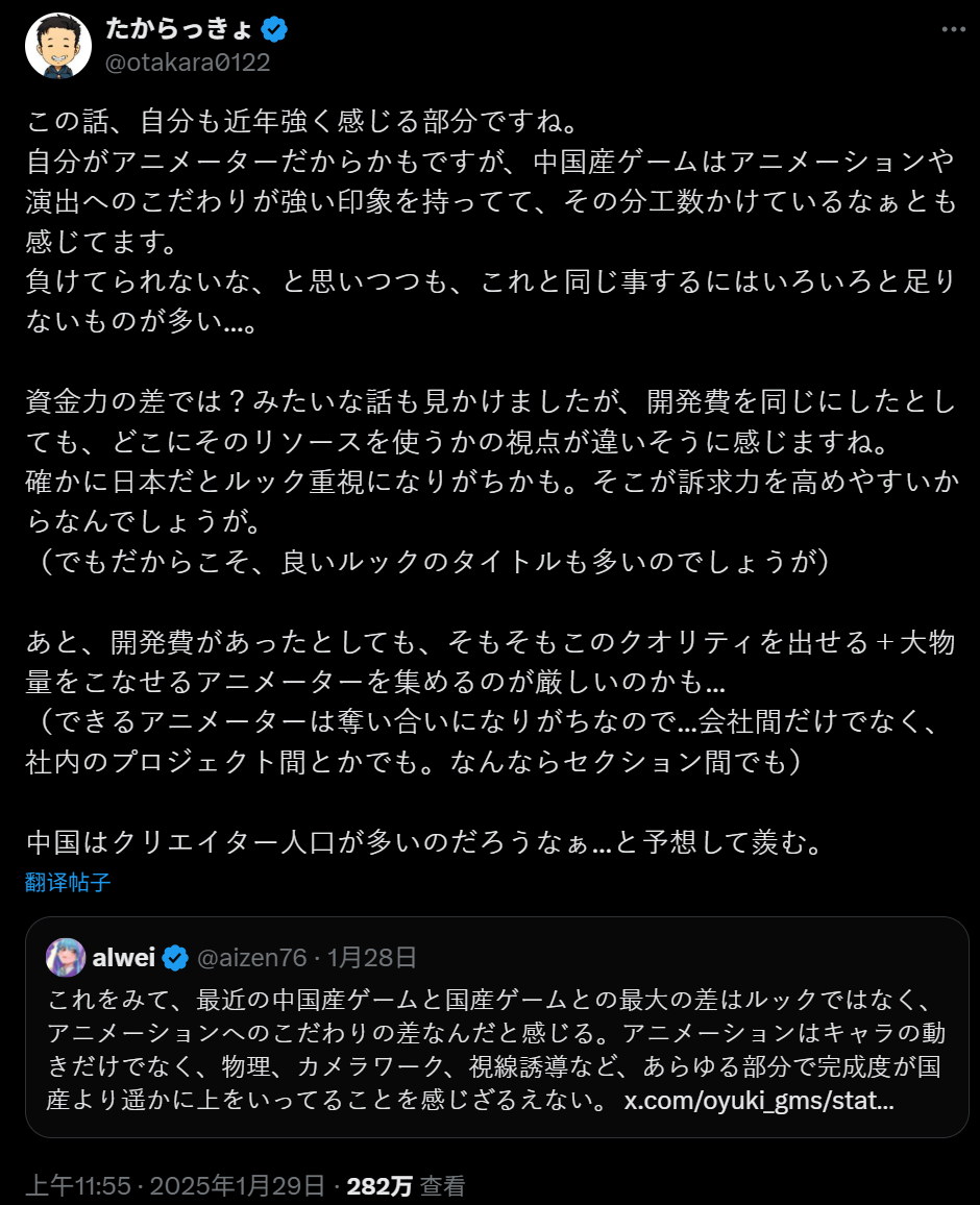 这一观点得到日本动画师たからっきょ的印证:“近年来,中国游戏的动画表现力已形成代差优势。问题不在于预算高低,而是分配逻辑——日本厂商更倾向于堆砌画面表现,因为这是‘最直观的卖点’。即便预算相同的情况下,动画人才储备与制作体系也已无法支撑同等精细度的内容产出。”