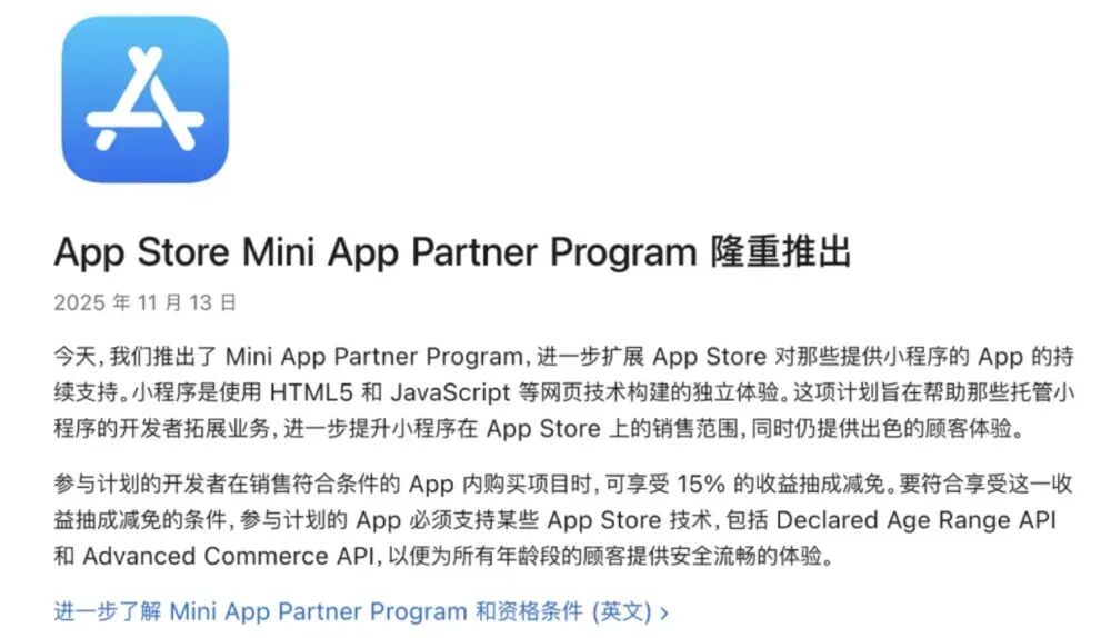 【1】11月14日,微信与苹果共同宣布,小游戏将在iOS端支持虚拟支付。同时,苹果会针对小程序端推出相关合作计划,其中,参与“小程序合作伙伴计划”的开发者在销售符合条件的APP内购买项目时,可享受15%的收益抽成减免。这意味着苹果、腾讯(微信)在小程序生态的规则上达成了重要妥协与合作,结束了一场长达数年的“冷战”。