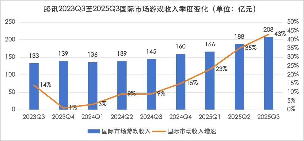 【2】11月13日,腾讯发布2025年Q3业绩报告。财报显示,腾讯Q3总收入为1929亿元(人民币,下同),同比增长15%。其中,游戏业务表现尤为突出,收入为636亿元,同比增长22%,成为拉动整体增长的重要引擎。在本土市场,腾讯游戏收入达428亿元,同比增长15%;在国际市场,腾讯游戏收入达208亿元,同比增长43%。