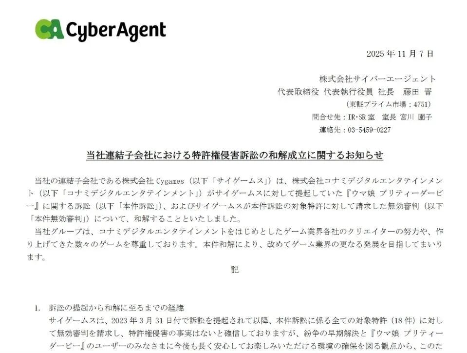 根据CyberAgent的公告,Cygames依旧坚持不存在任何专利侵权行为,决定与科乐美达成庭外和解是为了“确保《赛马娘》粉丝们能够安心地继续享受游戏。”