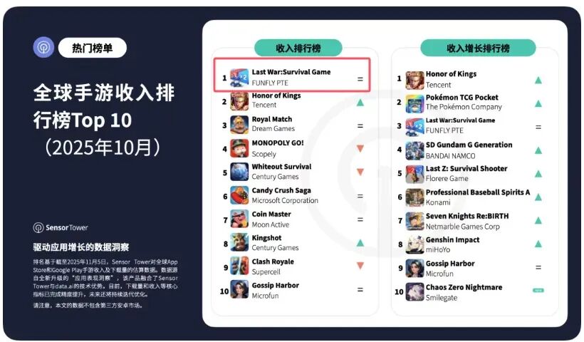 【5】近日,SensorTower发布了2025年10月全球手游收入榜,由FUNFLY发行的《Last War: Survival Game》蝉联榜首,这也是这款游戏连续第四次登顶全球手游收入榜首。此外,10月迎来十周年庆典的《王者荣耀》收入从10月24日开始显著上升,庆典活动推动游戏内购收入环比增长11%。