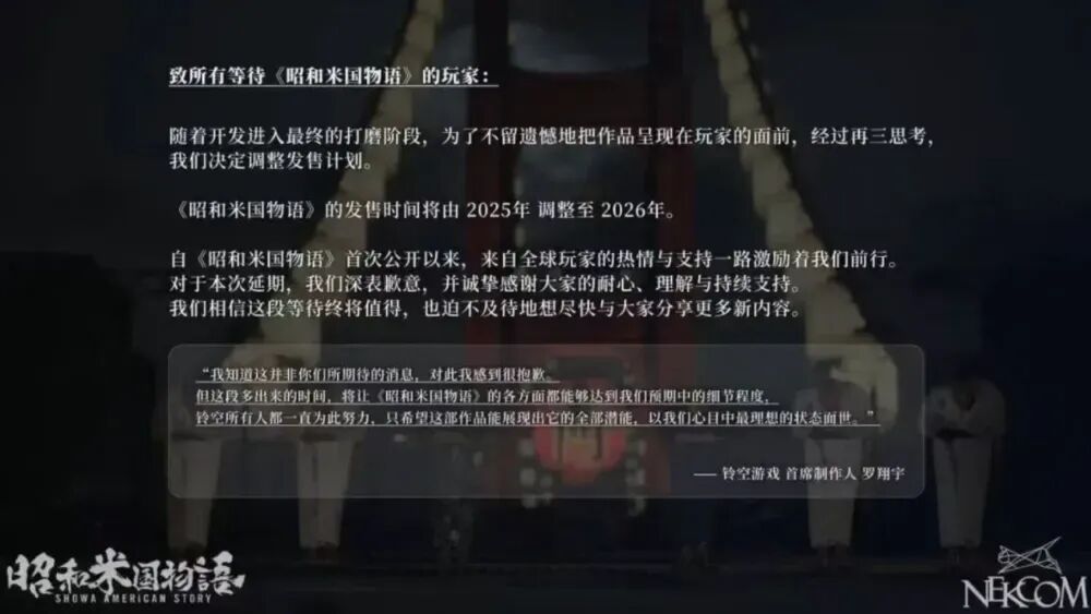 【8】日前,铃空游戏宣布《昭和米国物语》发售计划调整,原定于2025年发售日期调整至2026年。制作人表示,此次调整是为了确保游戏内容达到预期品质,目前项目已进入最终打磨阶段。《昭和米国物语》以80年代流行文化为背景,采用B级片视觉风格,讲述少女"蝶子"在末世北美的复仇与成长之旅。