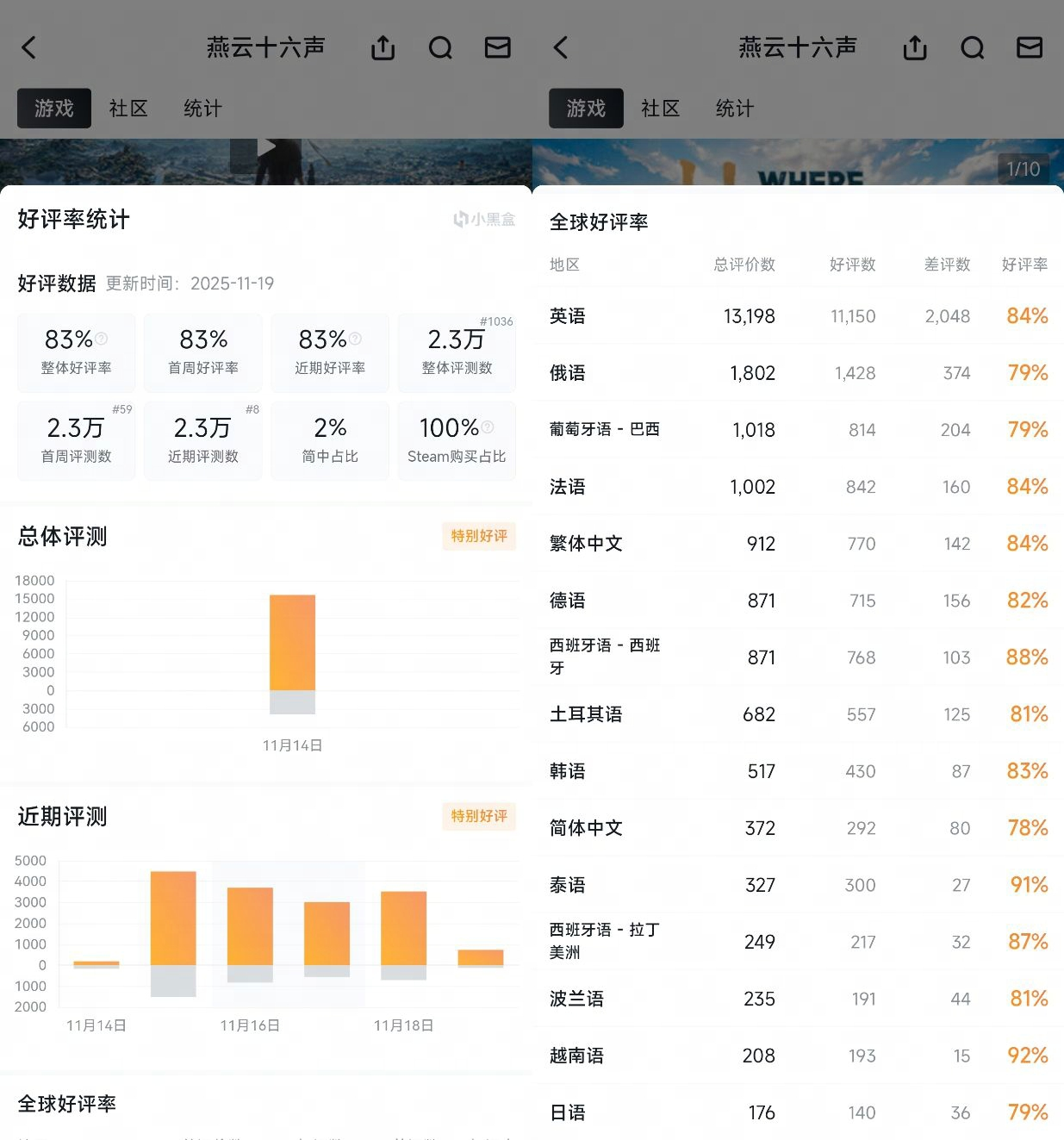 截至目前,《燕云十六声》在Steam平台上已收获超过2.3万条评测,总体好评率高达83%,达到“特别好评”级别。其中,来自非简体中文玩家的好评占比98%,英文区好评占比60%,且好评率达到84%,这充分反映出《燕云十六声》在欧美等西方主流市场的认可度。