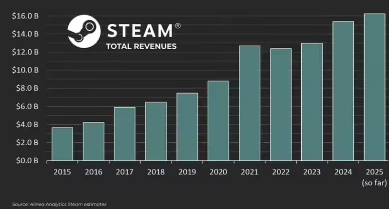 国内厂商愈发将Steam视为一个重要战场,与之相对的,是该平台持续十年几乎连续不断的增长。据数据分析公司Alinea Analytics估算,Steam在2025年1月至11月中旬营收达到162亿美元(约合1151亿元人民币),能直观看出其收入规模在过去十年翻了约4倍。