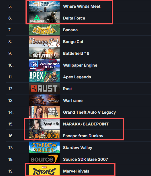 连续不断的重磅产品轰炸,再加上腾讯投资工作室的项目、网易的《永劫无间》和其他国产游戏,如今在Steam平台畅销榜、在线人数排行榜前列,国内游戏厂商包揽了一大片的盛景已经不算稀奇。