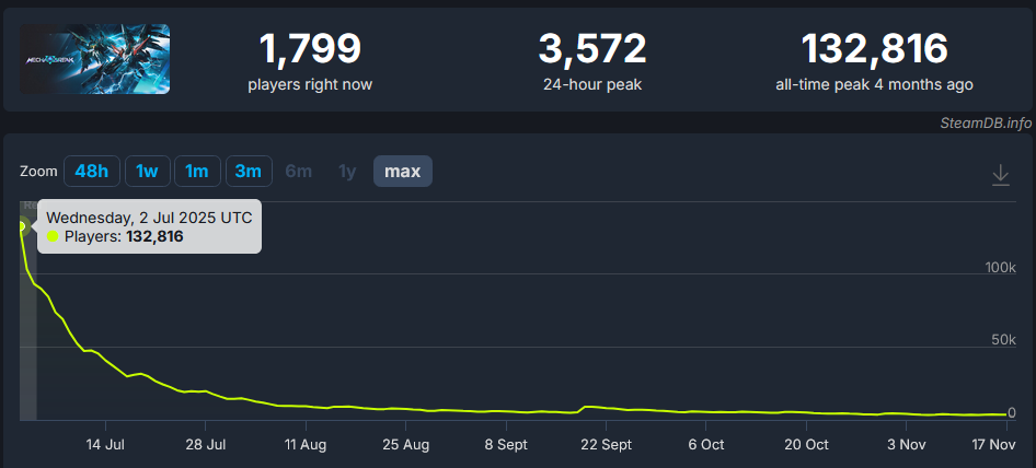 其中《解限机》就是一个令人惋惜的案例,《解限机》有一个令人振奋开局,正式上线后最高在线人数一度突破13万,在机甲题材中十分少见,但近日的数据已经跌落至不足4000。