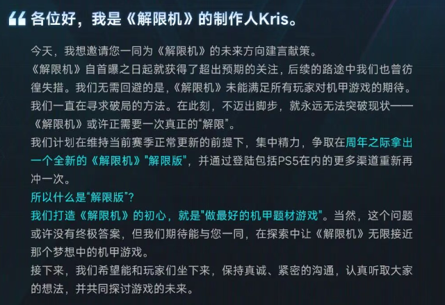 就在本月,《解限机》制作人Kris(郭炜炜)也对游戏上线以来的情况做了一次全面回应,表示将“争取在周年之际拿出一个全新的《解限机》’解限版’”。