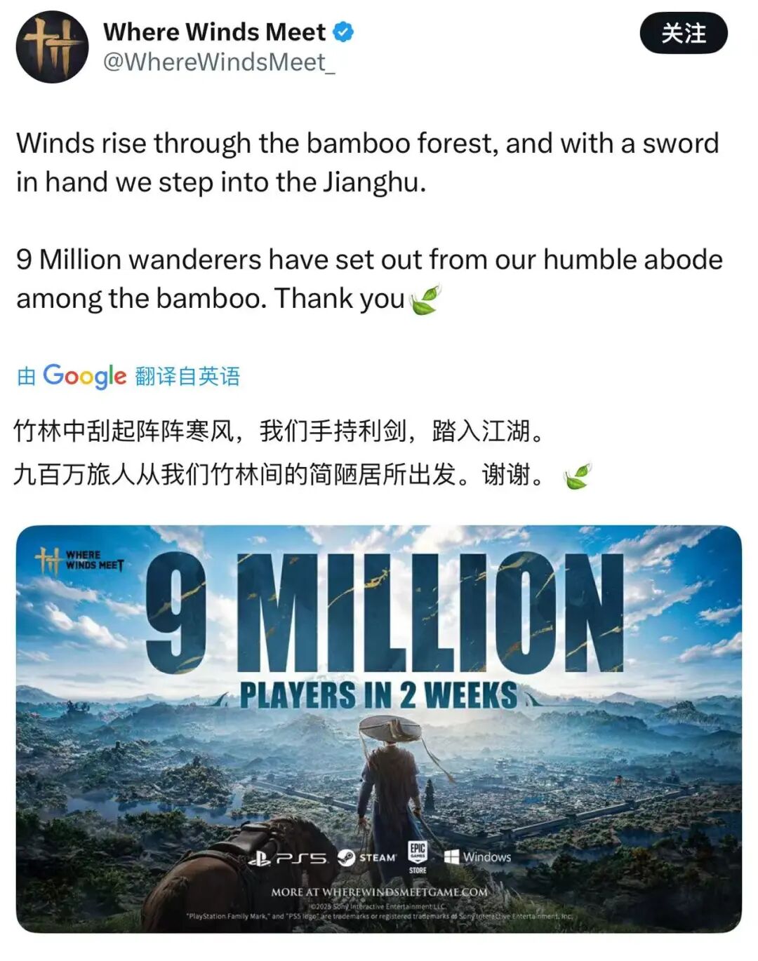 11月30日,《燕云十六声》的官方账号在社交媒体X发文,宣布两周内的游玩人数已达900万,这一数据涵盖了PC和PS5平台。