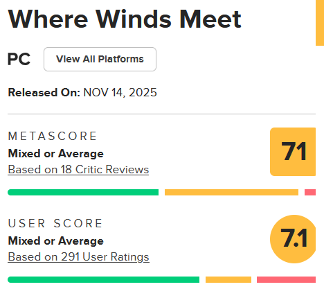 相比Steam社区的整体反馈,海外媒体给到的评价似乎更加复杂一些,《燕云十六声》在知名评分网站Metascore在媒体评分和玩家评价分别为71和7.1。