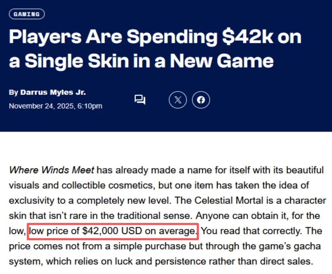 再如外媒comicbook在认可游戏优秀的视觉画面和藏品道具设计的同时,也为平均抽取价值超过4万美元的高级皮肤“人间仙”感到惊呼,认为这是一种玩家在游戏社交体验中的顶级资本。