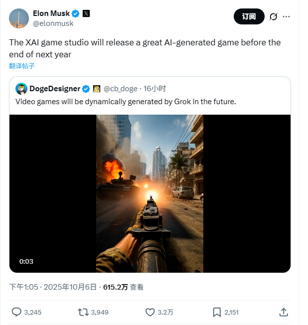 而在今天,另一股跃跃欲试的“游戏势力”当属AI公司。去年底寻求转型的AI智驾车企图森未来就设立了新品牌CreateAI,对外公布了新项目《金庸群侠传》;而在海外,马斯克也不断在游戏圈刷新存在感,不止一次为宣称要做AI原生游戏的XAI部门造势。