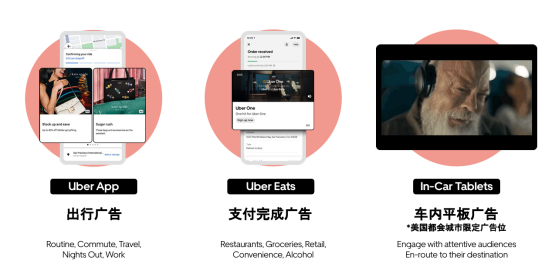 ① Uber出行广告:覆盖从司机匹配 → 等待上车 → 行程中的多方互动,广告投放可实现平均90–100秒的品牌曝光,且全程独占无他品干扰,支持1–5 张图片轮播或视频素材的完整叙事、沉浸式呈现。