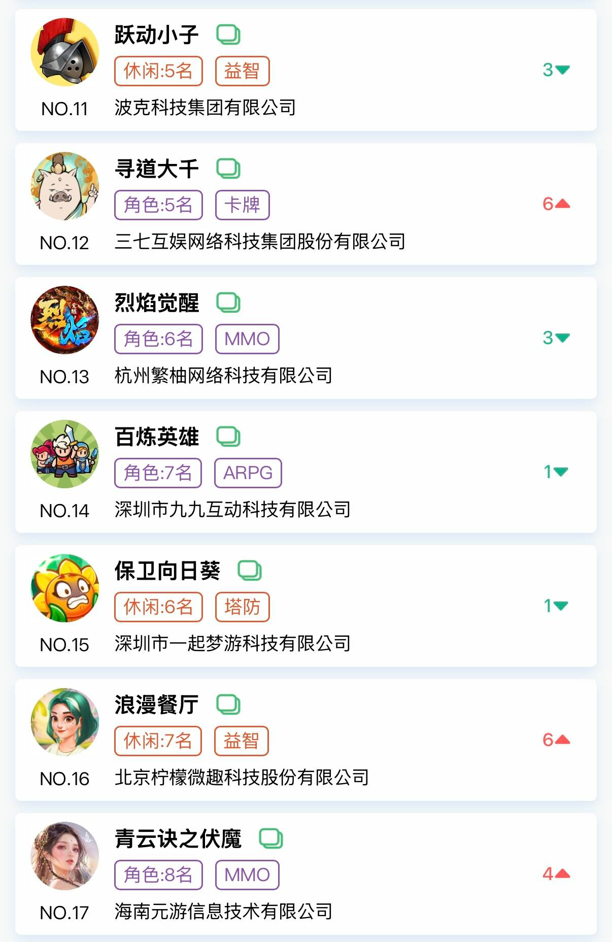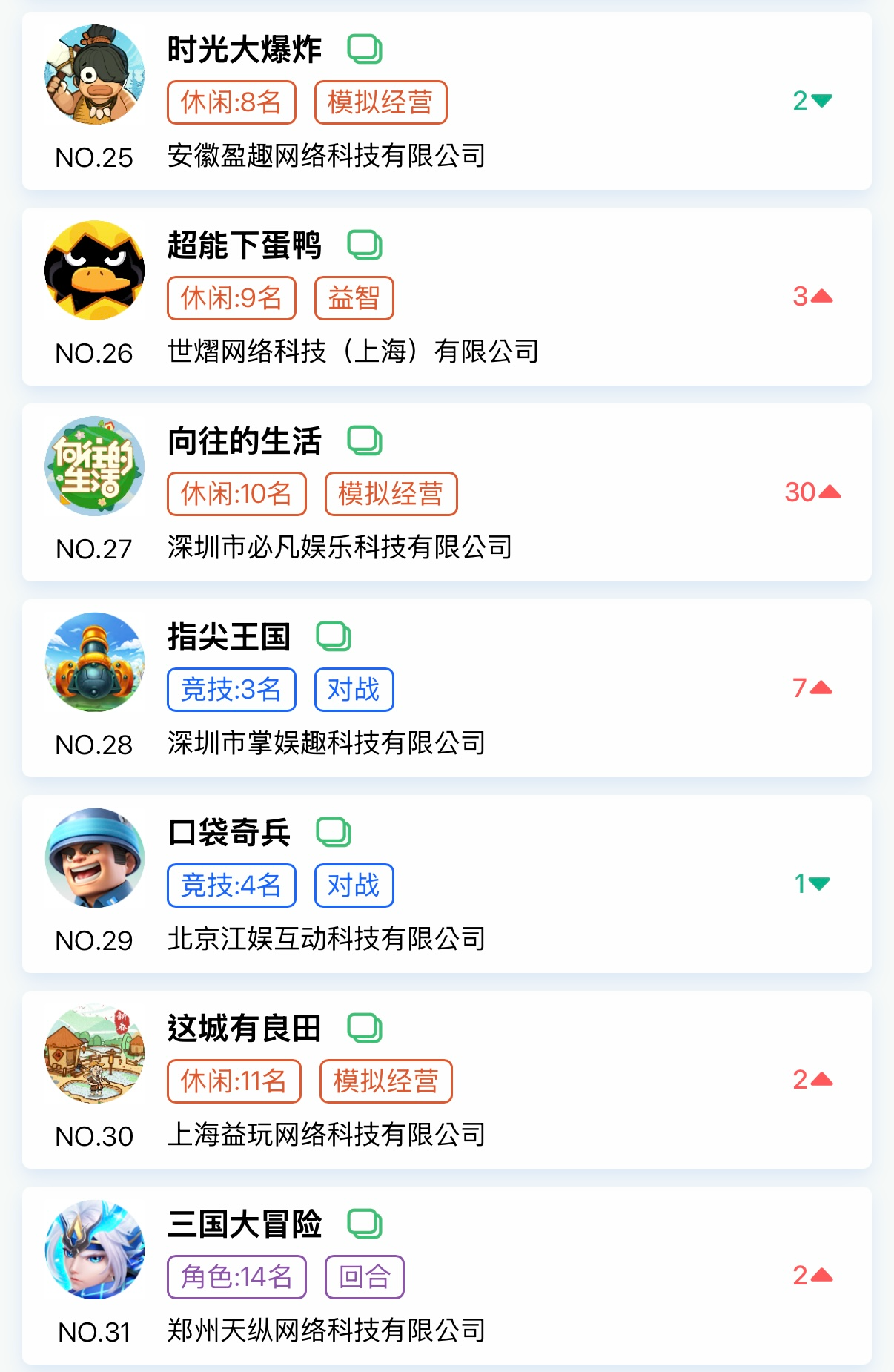 这款由芒果互娱授权综艺IP的小游戏相比上一期排名大幅前进了30名,主打二合的模拟经营玩法已经非常成熟,配合IP本身号召力,对玩家有一定的吸引力。