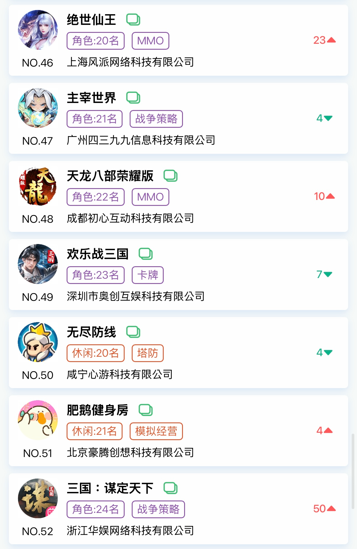 支持与APP版数据互通的《三谋》小游戏也顺势而上,本期排名上升50名,来到榜单第52位。
