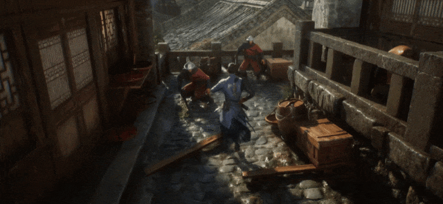 A:从公开的视频里能看到,场景里有很多五行可以互动的东西。当你经过时都会有标亮的提示,按L1就可以互动,一般是把场景物品扔到面向方向或者最近的敌人。