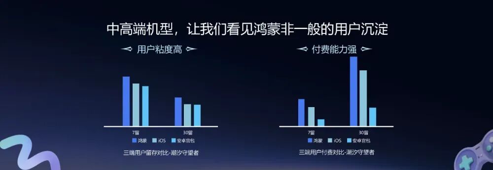 这意味着在买量成本高企的今天,鸿蒙不仅提供了一个1300万玩家规模的庞大流量池,更重要的是,鸿蒙游戏的用户画像,为游戏厂商筛选出了一批消费能力和意愿更强的用户。这为游戏后续的商业化,提供了一个更高的起点。