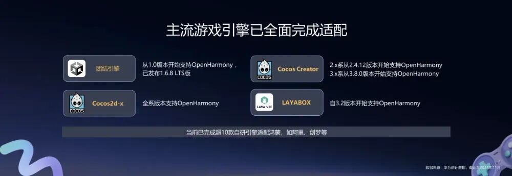 Cocos、团结引擎、LayaBox等主流游戏引擎,以及FMOD、Wwise等常用的第三方SDK都已完成HarmonyOS或者OpenHarmony适配。这意味着开发者不需要从零开始,他们熟悉的工作流和工具链基本上可以平移过来。