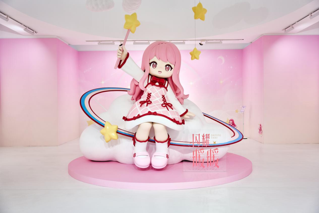 展厅中央,近3米高的巨型暖暖雕塑格外醒目,身着《闪耀暖暖》的初始套装「诗意绽放」,暖暖站在一切的起点。