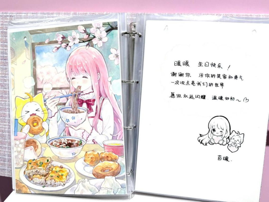 那本跨越十二座城市、20余位画师与创作者共同绘制的生贺接力画册里,爱穿山越海,将素未谋面的人们,连接进同一个温暖的故事里。有人想带暖暖尝遍家乡美食,有人愿她岁岁无忧,有人希望她永远闪耀。